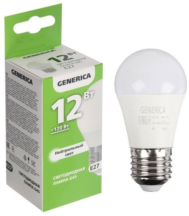Лампа светодиодная G45 12Вт шар 4000К E27 230В GENERICA, IEK LL-G45-12-230-40-E27-G (1 шт.)