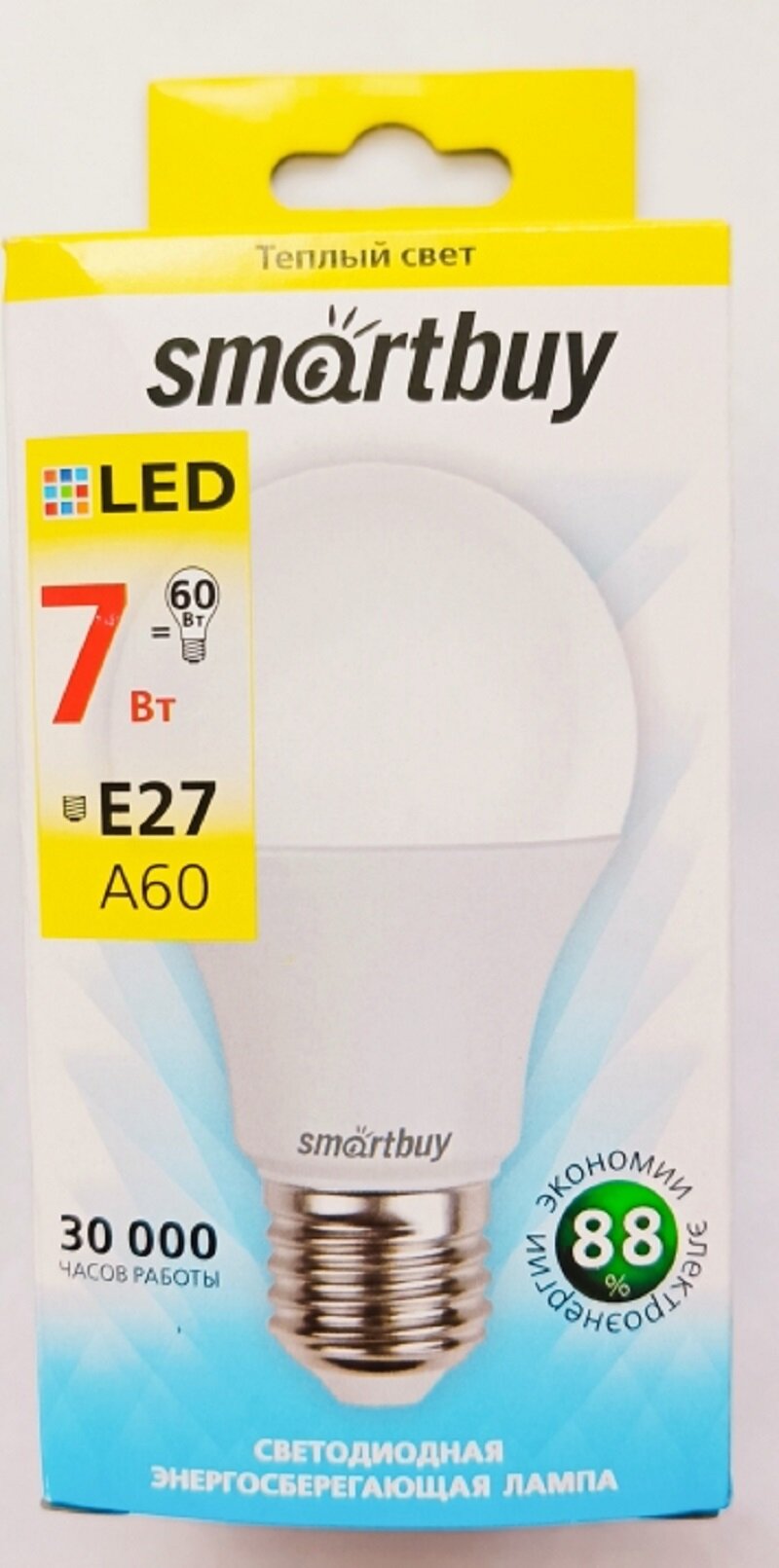 Лампа cветодиодная Smartbuy, A60, E27, 7 Вт, 3000 К, теплый белый