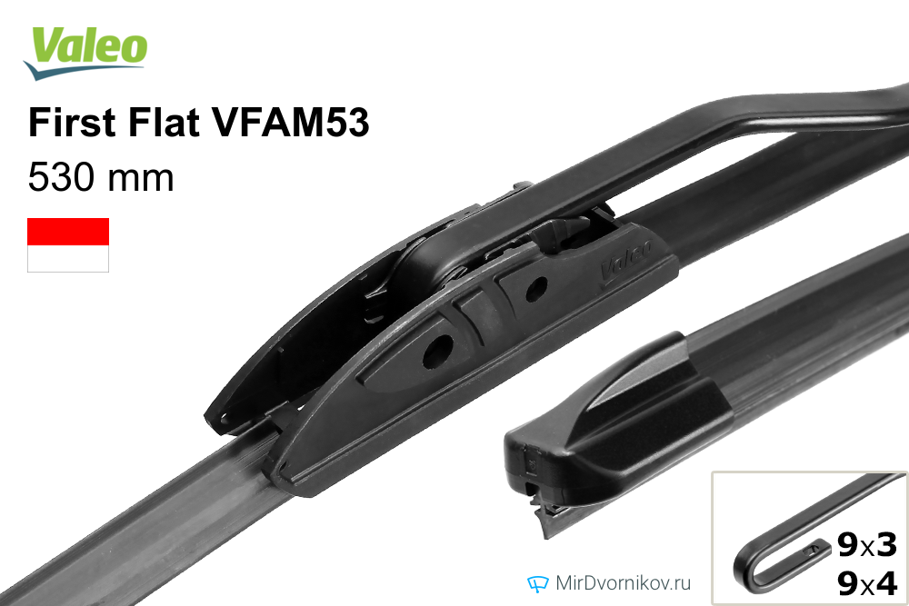 Бескаркасная щетка стеклоочистителя Valeo First Flat VFAM53, 530 мм. Крючок 9*3 / 9*4