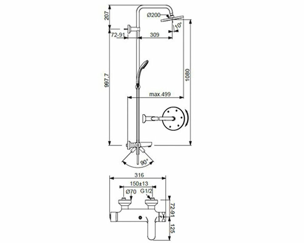 | Дополнительная информация | высота стойки для душа: 1205 мм; диаметр душевой лейки: 80 мм; диаметр верхнего душа: 200 мм |