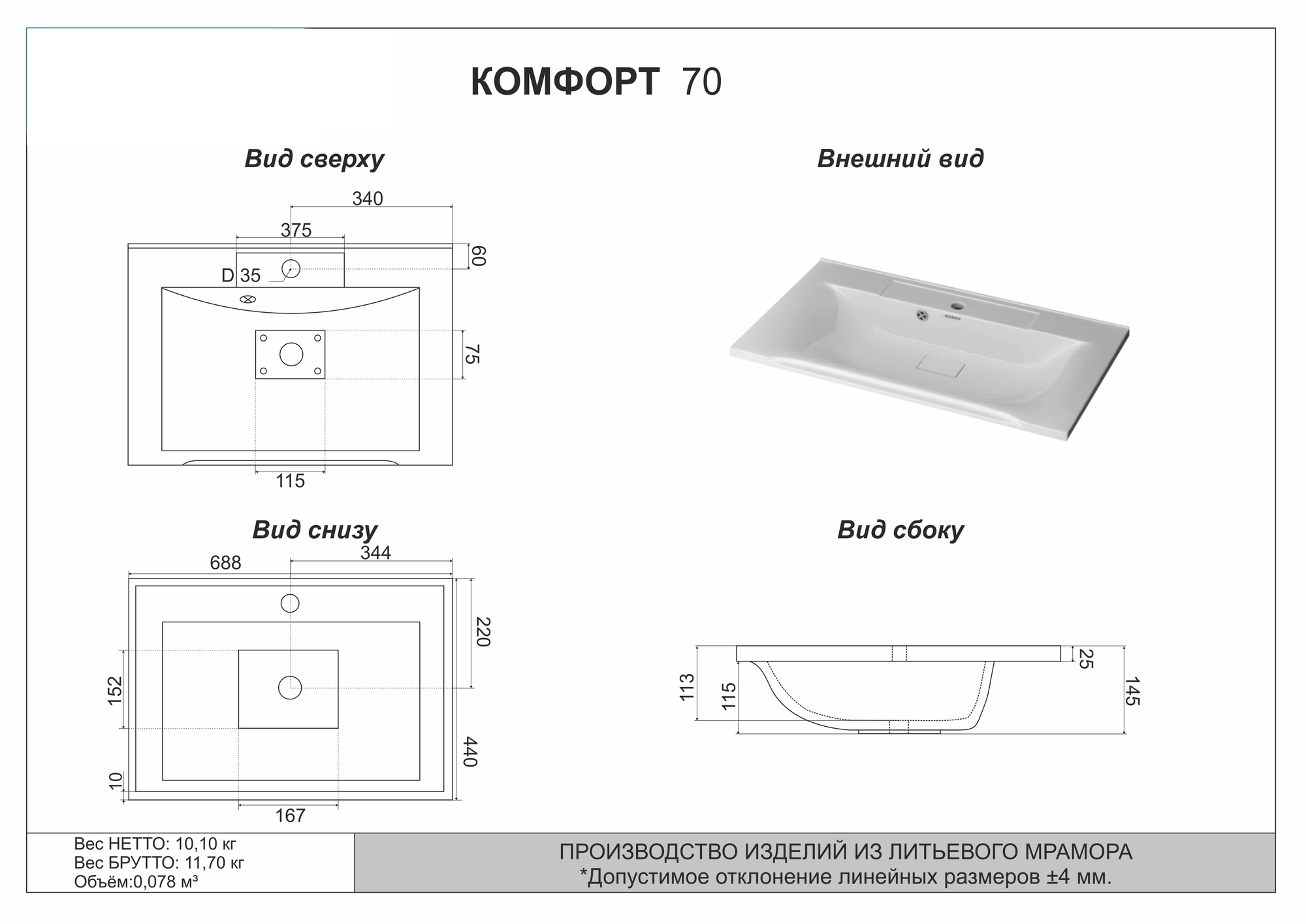 Раковина мебельная Комфорт 70, белая, литьевой мрамор, 69х44