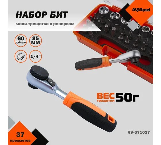 Набор бит и головок 1/4 AV Steel 37 предметов AV-071037