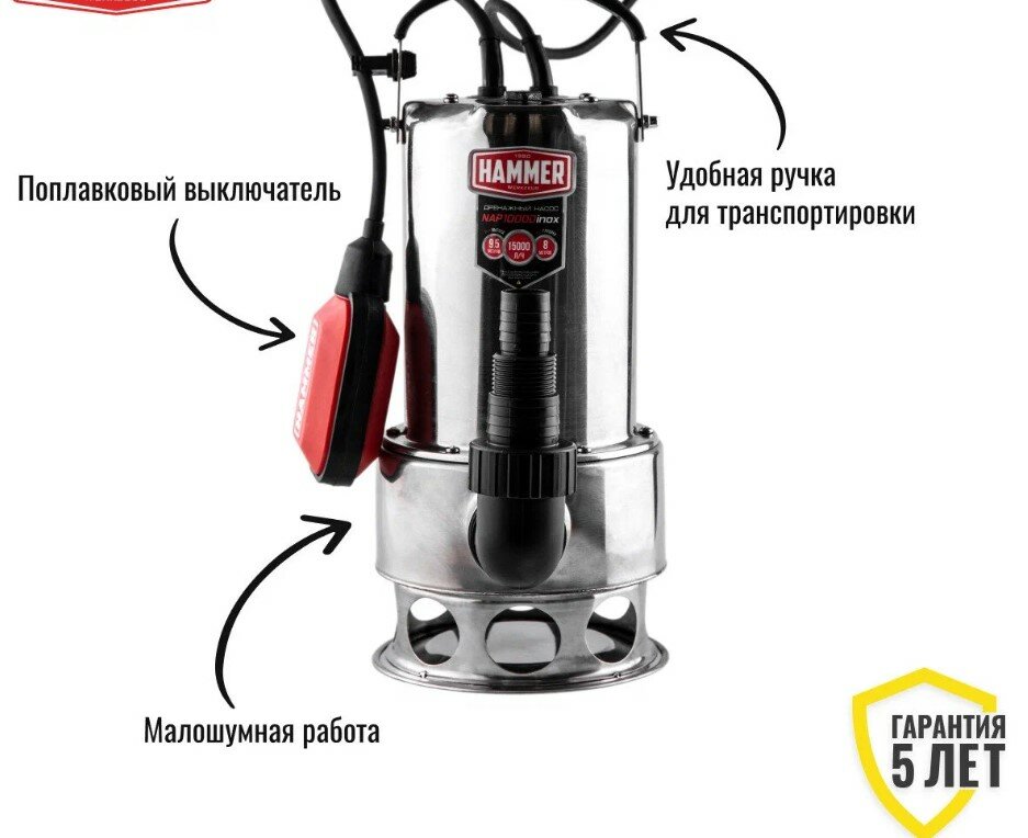 Насос дренажный Hammer NAP1000DInox 1000Вт 15000л/ч высота 9,5м, глубина 8м LM