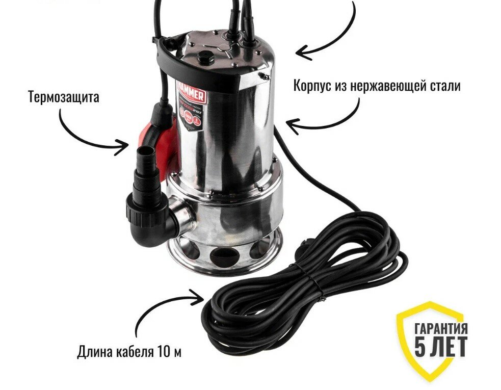 Насос для воды погружной Hammer NAP1000DInox, 1000 Вт, 15000 л/ч, для грязной, кабель 10м