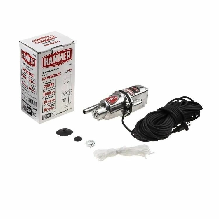 Насос для воды погружной вибрационный HAMMER NAP250UC, 250 Вт, 1060 л/ч, диаметр 95 мм, для чистой воды, кабель 25м
