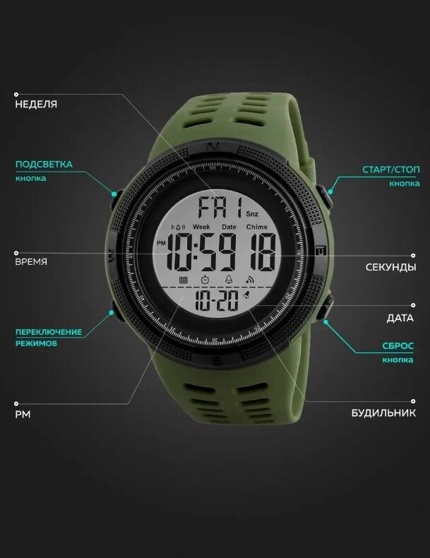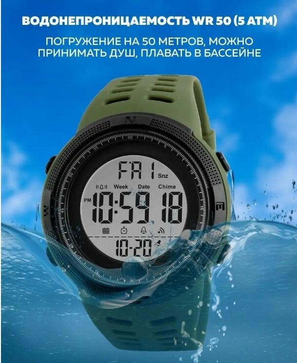 Часы мужские SKMEI 1251, водонепроницаемые, цвет зеленый милитари. Часы электронные.