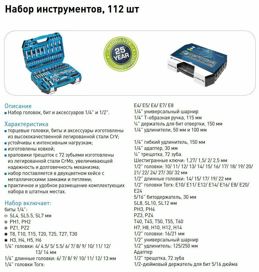 Набор инструментов, 112 шт., 1/4", 1/2" Hoegert интересное: