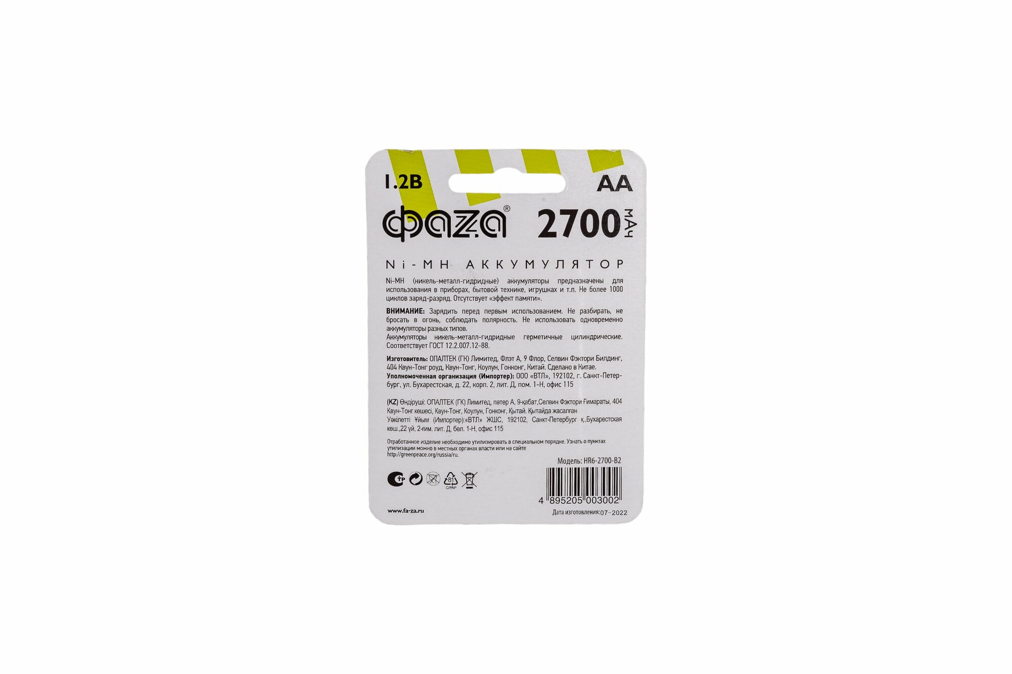 Купить Батарея аккумуляторная 2700 мА·ч, Ni-Mh, 1.2 В, АА (LR06, LR6), 2 шт, в блистере, ФАZА, 5003002
