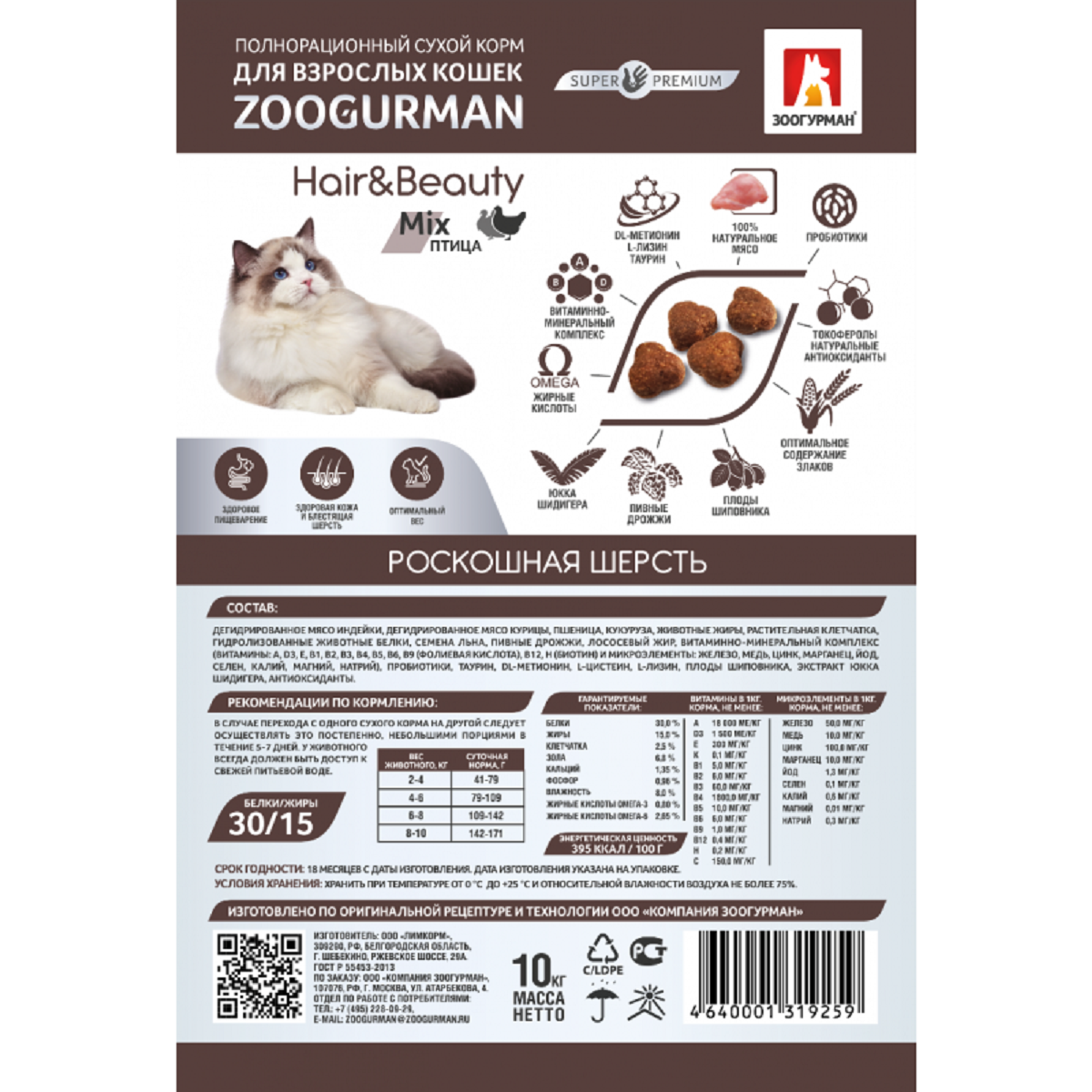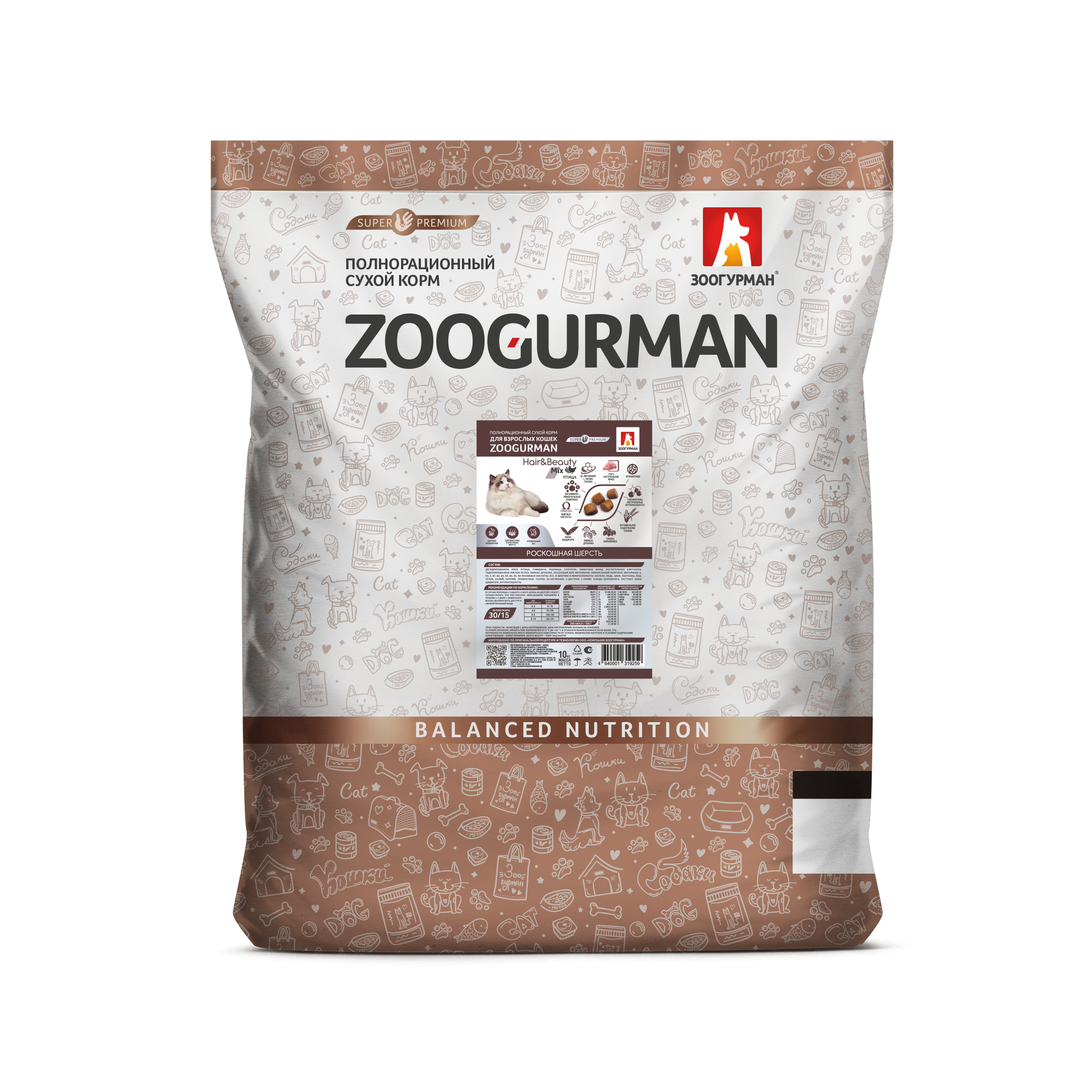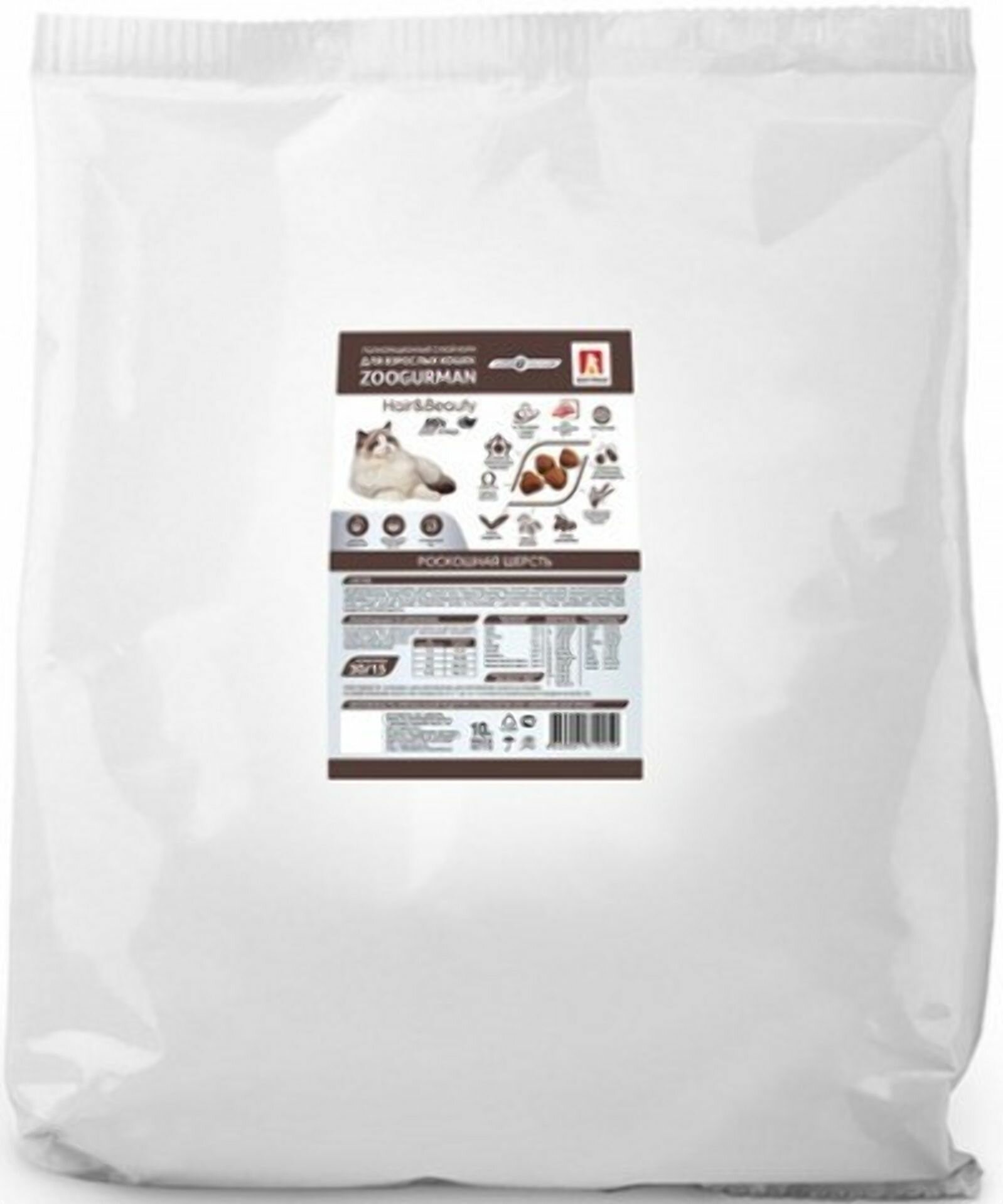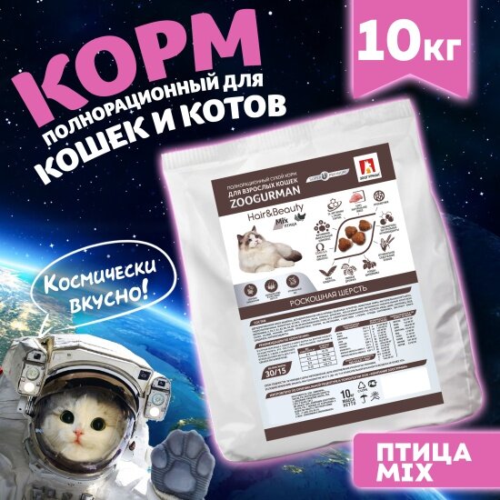 ZOOGURMAN HAIR & BEAUTY для взрослых кошек с птицей (10 кг)