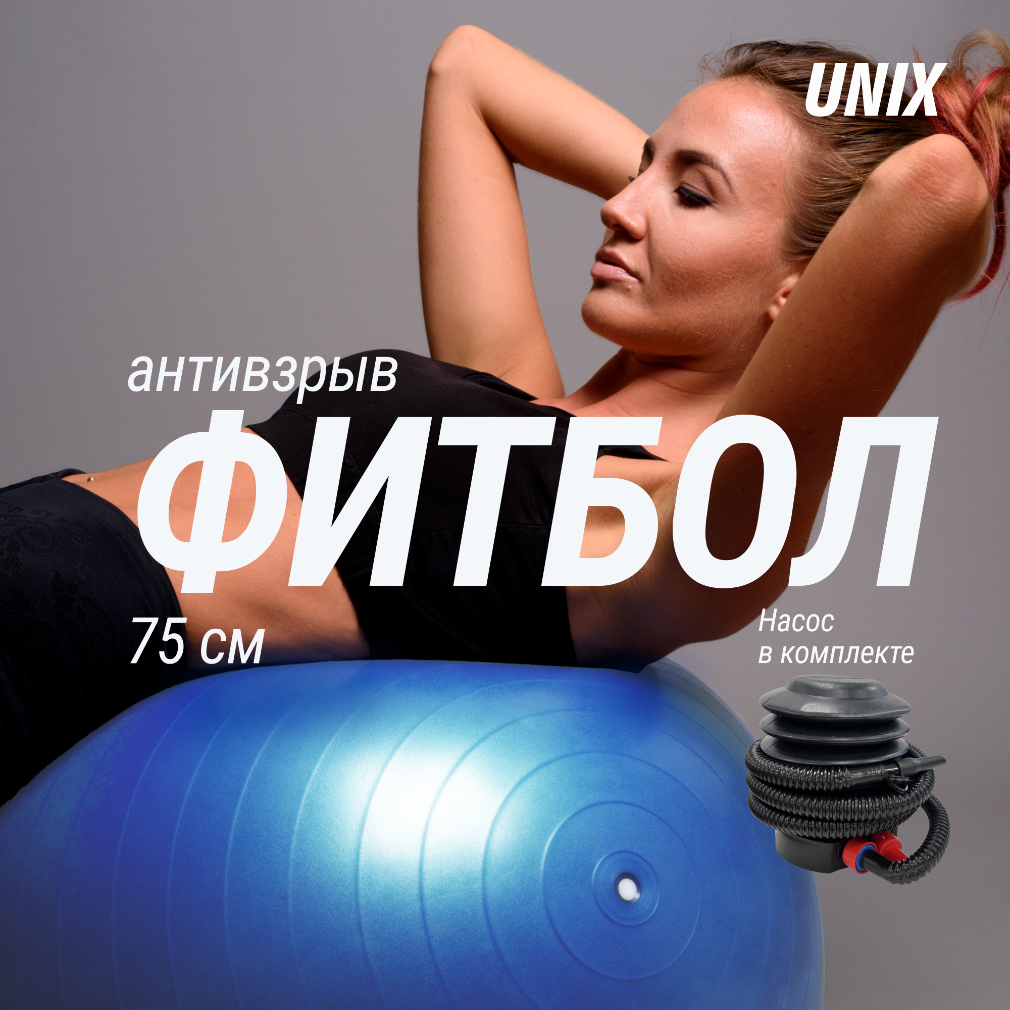 Фитбол UNIXFIT диаметр 75см. серый / насос в комплекте / мяч для фитнеса / гимнастический / для йоги / для аэробики / надувной