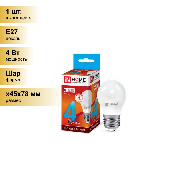 Светодиодная LED лампа IN HOME LED-ШАР-VC 4Вт 230В Е27 4000К 360Лм 4690612030593