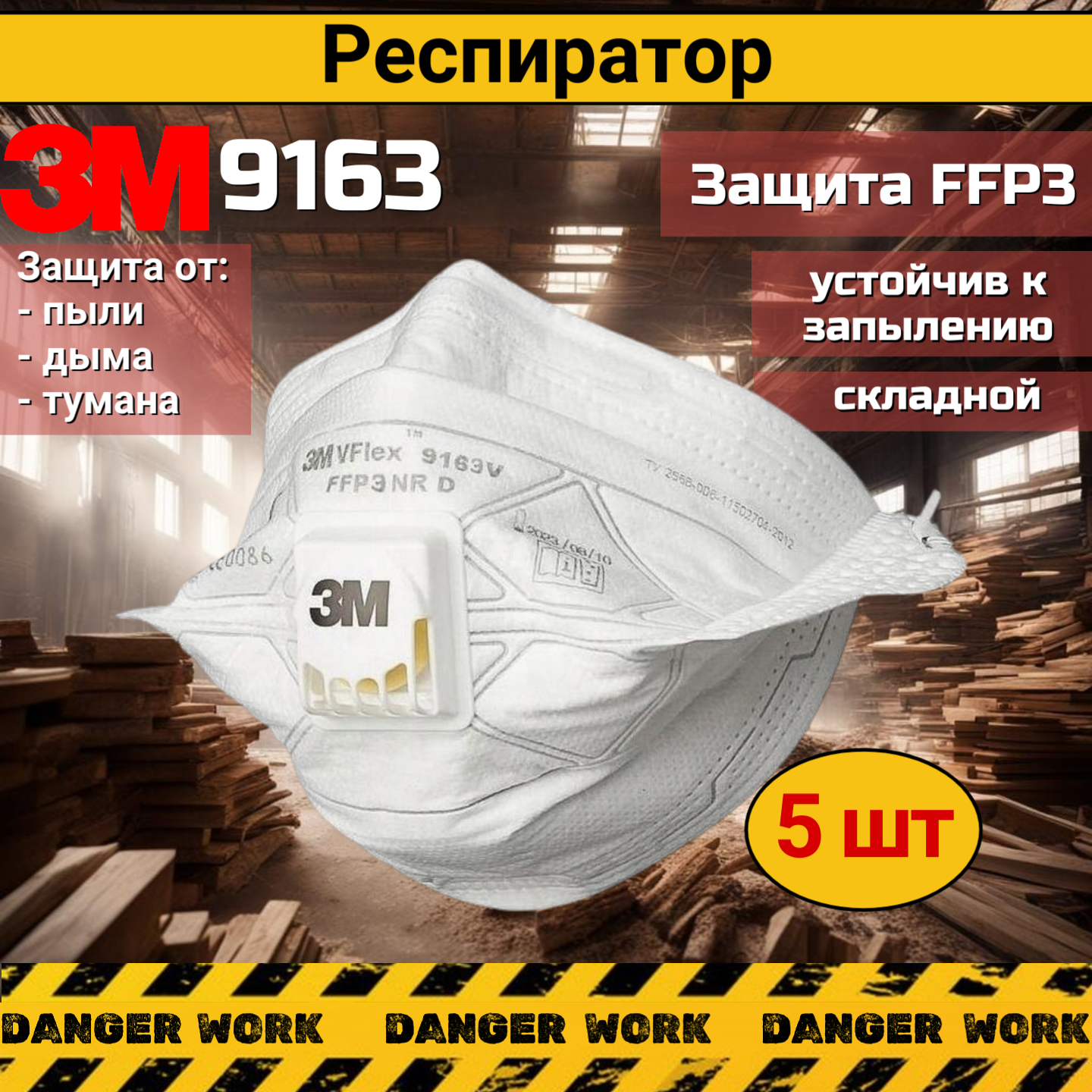 Респиратор 3M 9163V для защиты органов дыхания с клапаном FFP3, 5 шт
