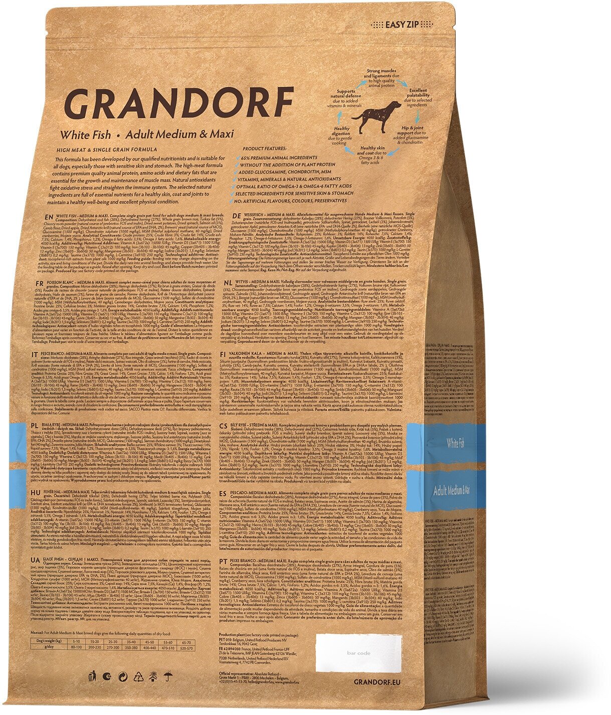 GRANDORF SINGLE GRAIN DOG ADULT MEDIUM & MAXI WHITE FISH низкозерновой для взрослых собак средних и крупных пород с белой рыбой (1 кг х 6 шт)