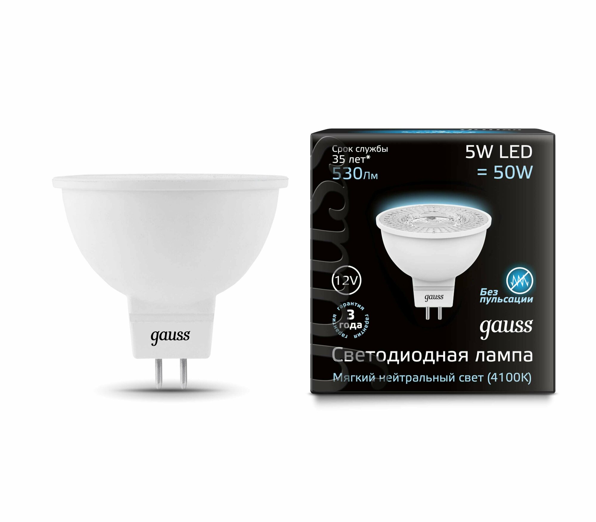10шт/уп. Лампа LED Спот 5Вт 12B MR16 GU5.3 530Лм 4100К Свет Нейтральный белый арт. 201505205 Gauss, уп. 10шт