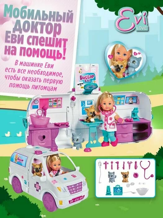 | Комплектация | кукла в одежде, 15 аксессуаров, собачка, кошечка, автобус мобильной клиники |