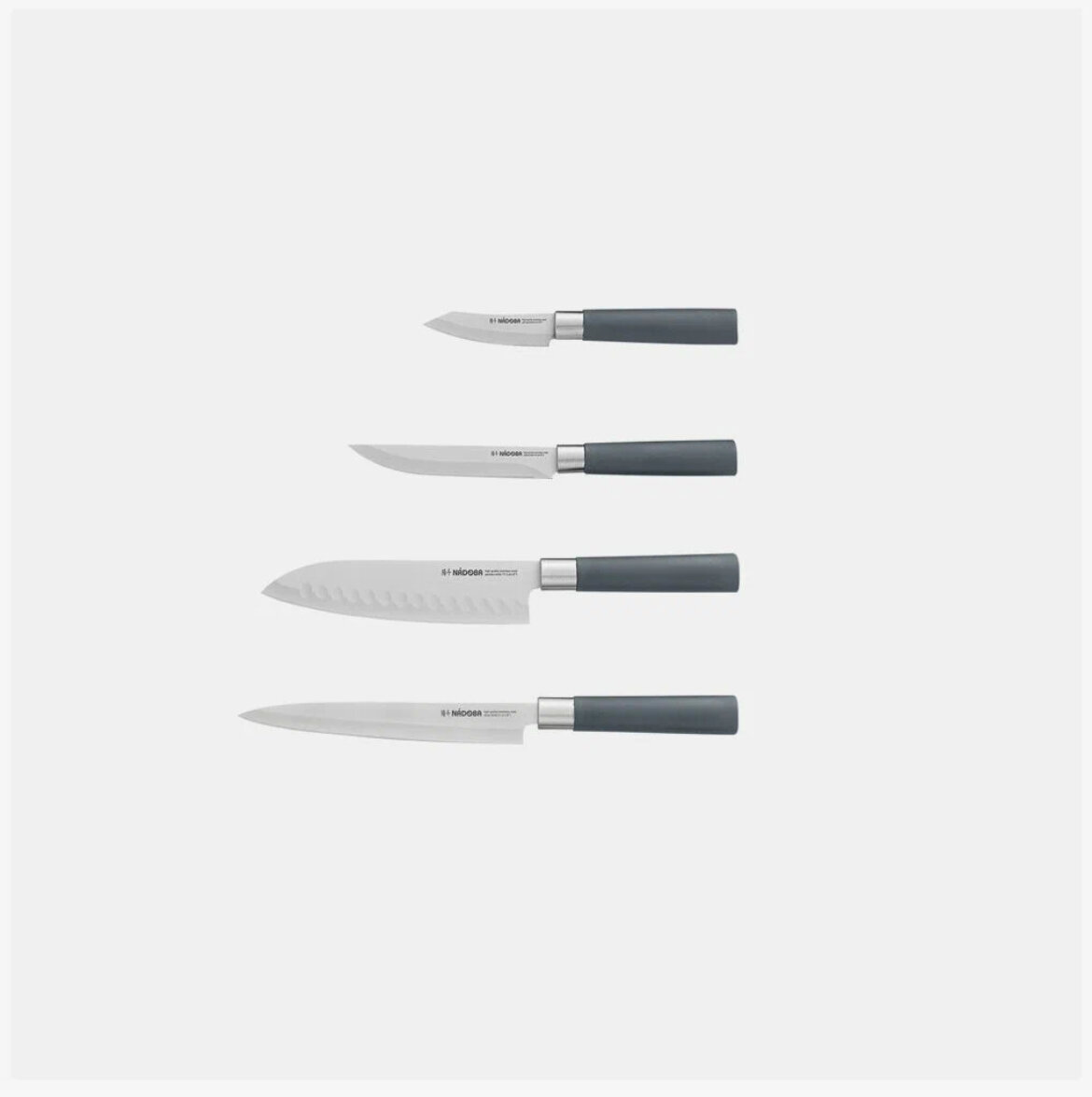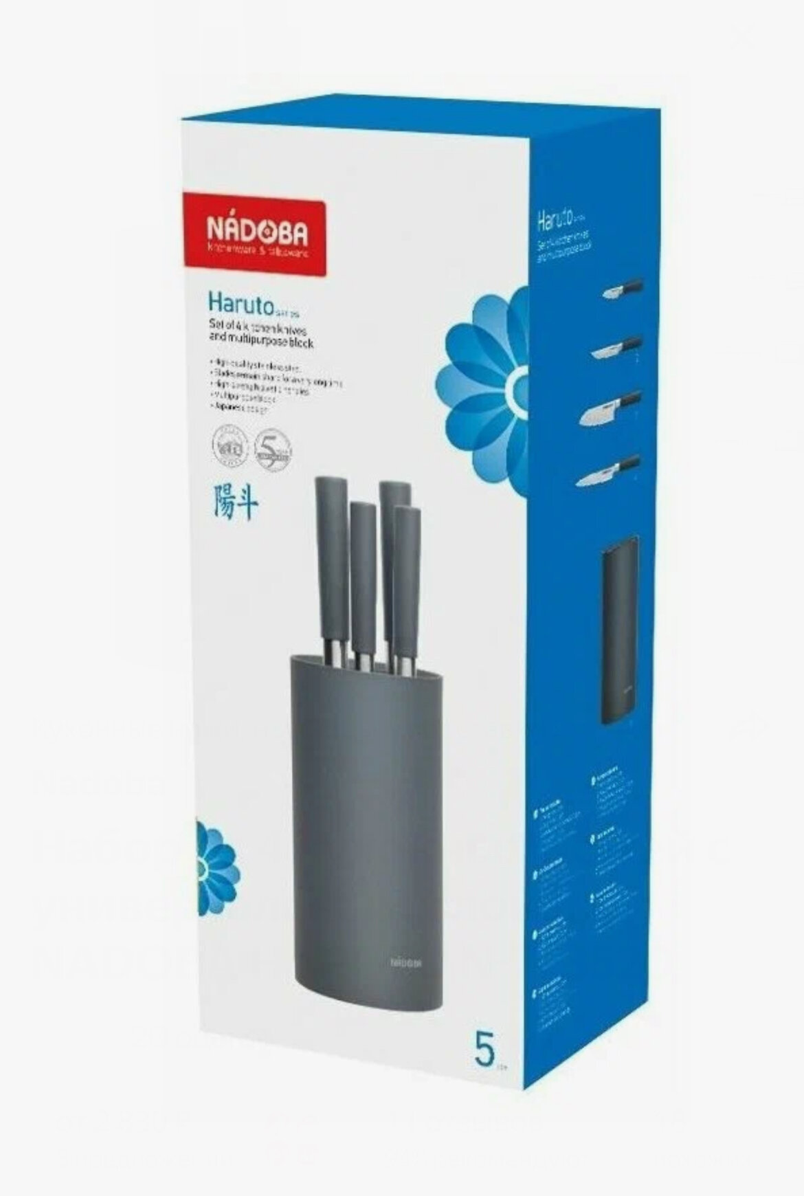 Набор из 4 кухонных ножей с универсальным блоком, NADOBA, серия HARUTOнож для овощей, 9 см; нож универсальный, 12,5 см; нож разделочный, 19 см;нож Сантоку с углублениями, 17,5 см;универсальный блок нового поколения (серый)