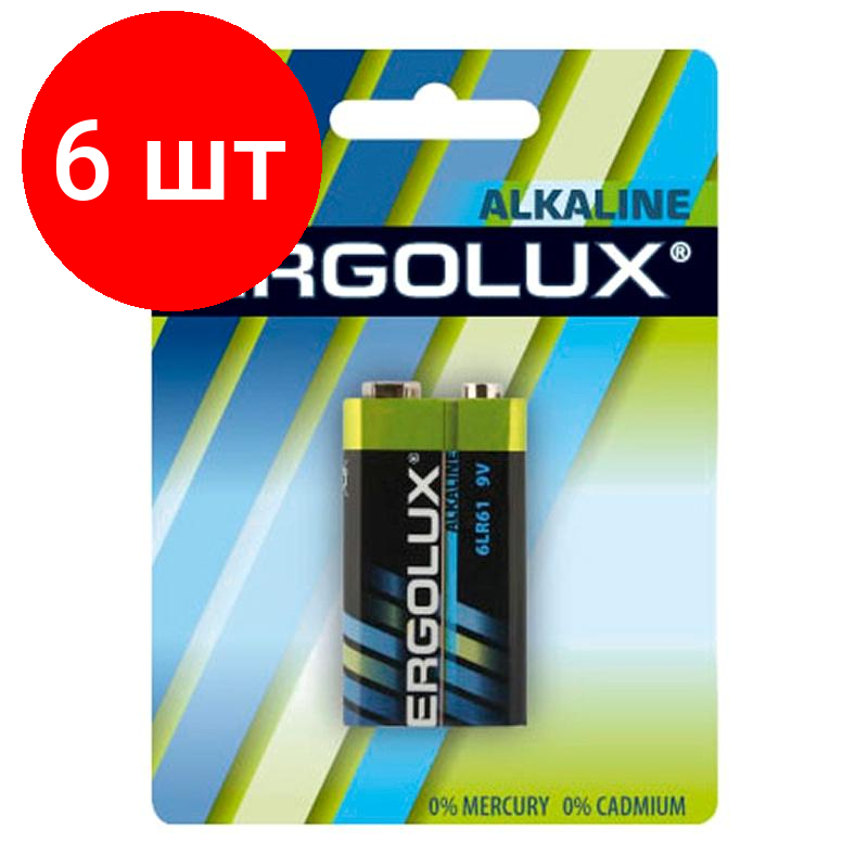 Купить Комплект 6 штук, Батарейка Ergolux 6LR61 Alkaline BL-1 (6LR61 BL-1, батарейка,9В)