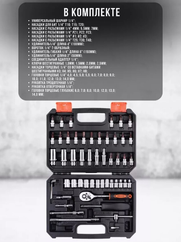| Головки торцевые подробно | 4, 4.5, 5, 5.5, 6, 7, 8, 9, 10, 11, 12, 13, 14 мм; удлиненные 1/4": 6, 7, 8, 14, 10, 12, 13 мм; со вставками: T10, T15, T20, H3, H4, H5, H6, H7, H8, PZ1, PZ2, PZ3, PH1, PH2, PH3, SL4, SL5.5, SL7 |