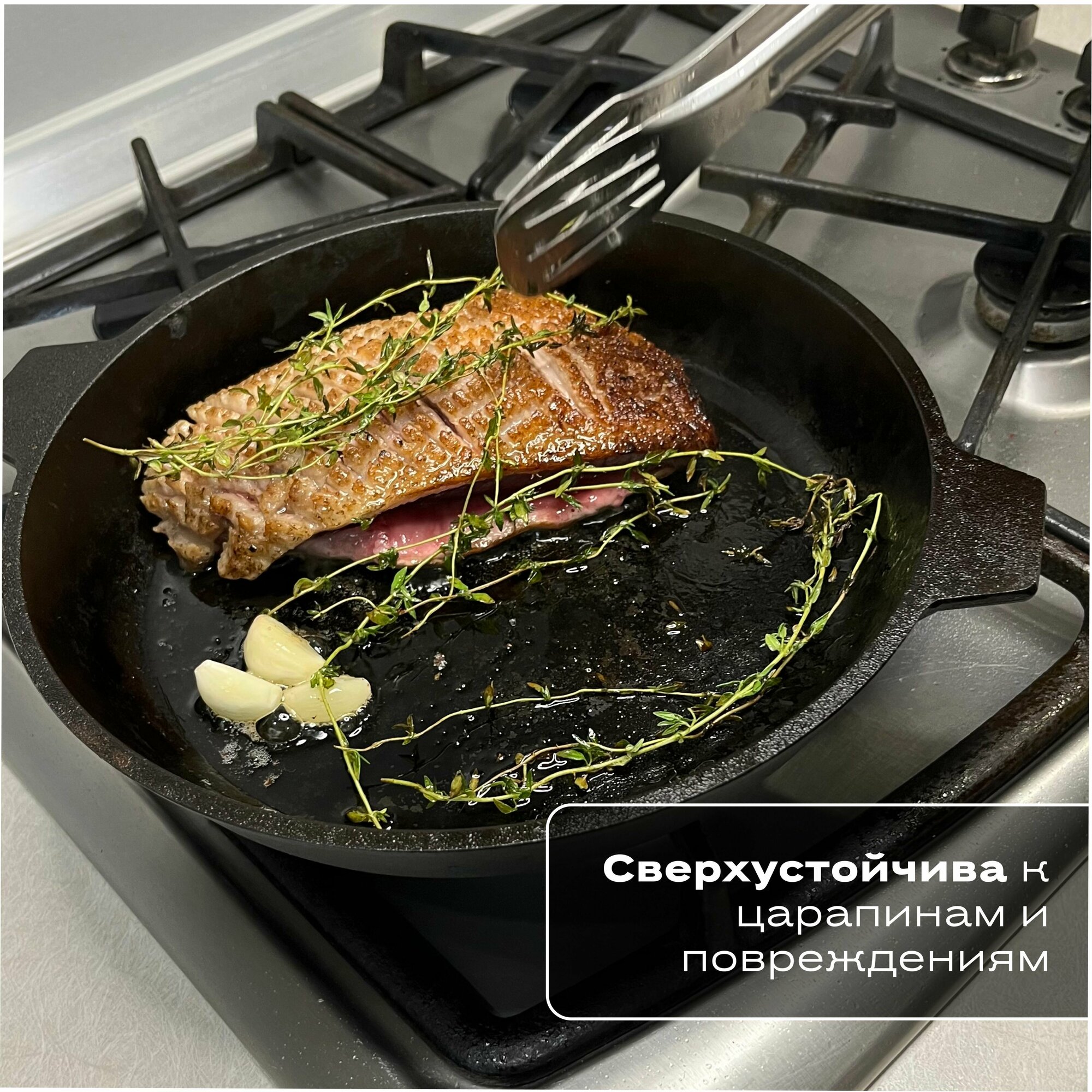 | Плюсы: | Чугунная посуда с толстым дном намного лучше всех остальных сковородок. Короткие литые ручки позволяют использовать её в духовке. |