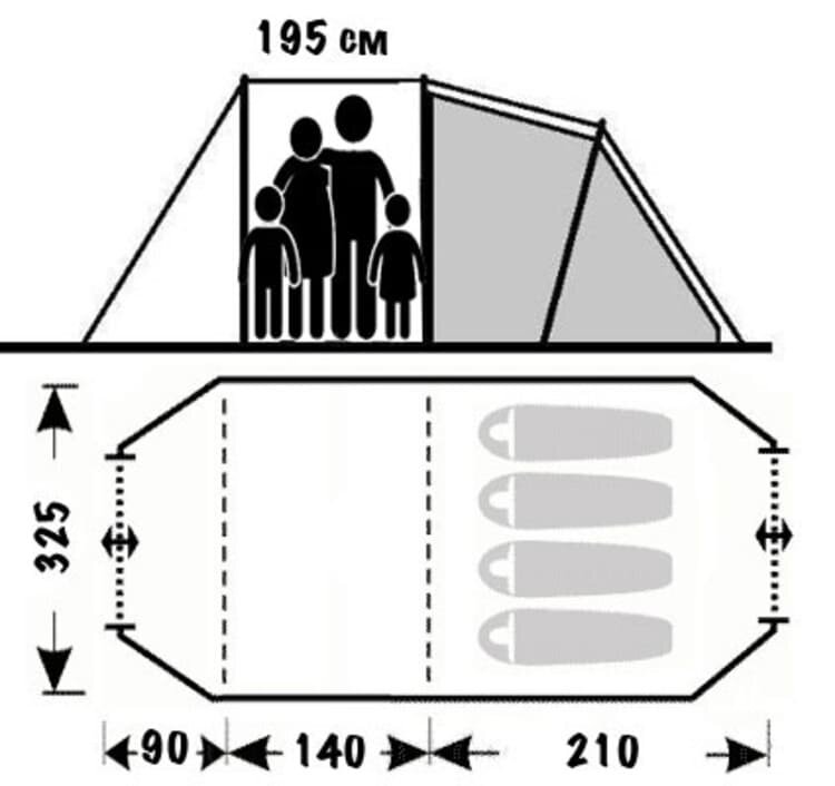 | Габариты внешней палатки(ДxШxВ) | 440x325x195 cм |