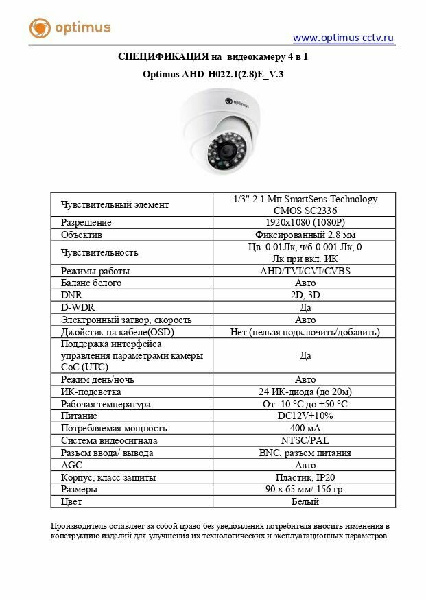 Optimus AHD-H022.1(2.8)E_V.3 Видеокамера