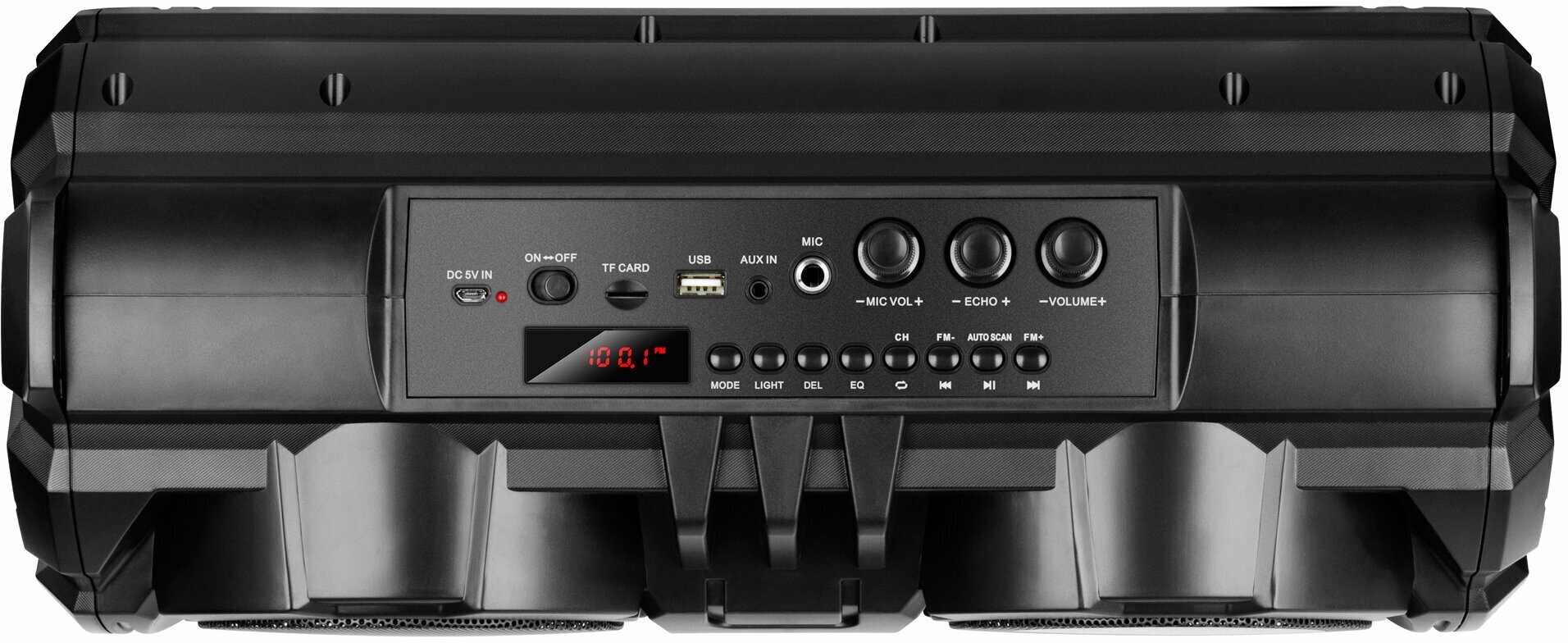 Отличные мягкие и мощные басы, отличная середина, высоких хватает. Все нужные режимы присутствуют: Bluetooth, AUX, SD-карта, USB-флешка, FM-радио и даже Караоке. Подсветка тоже прикольная - не выглядит по-китайски дешево. |