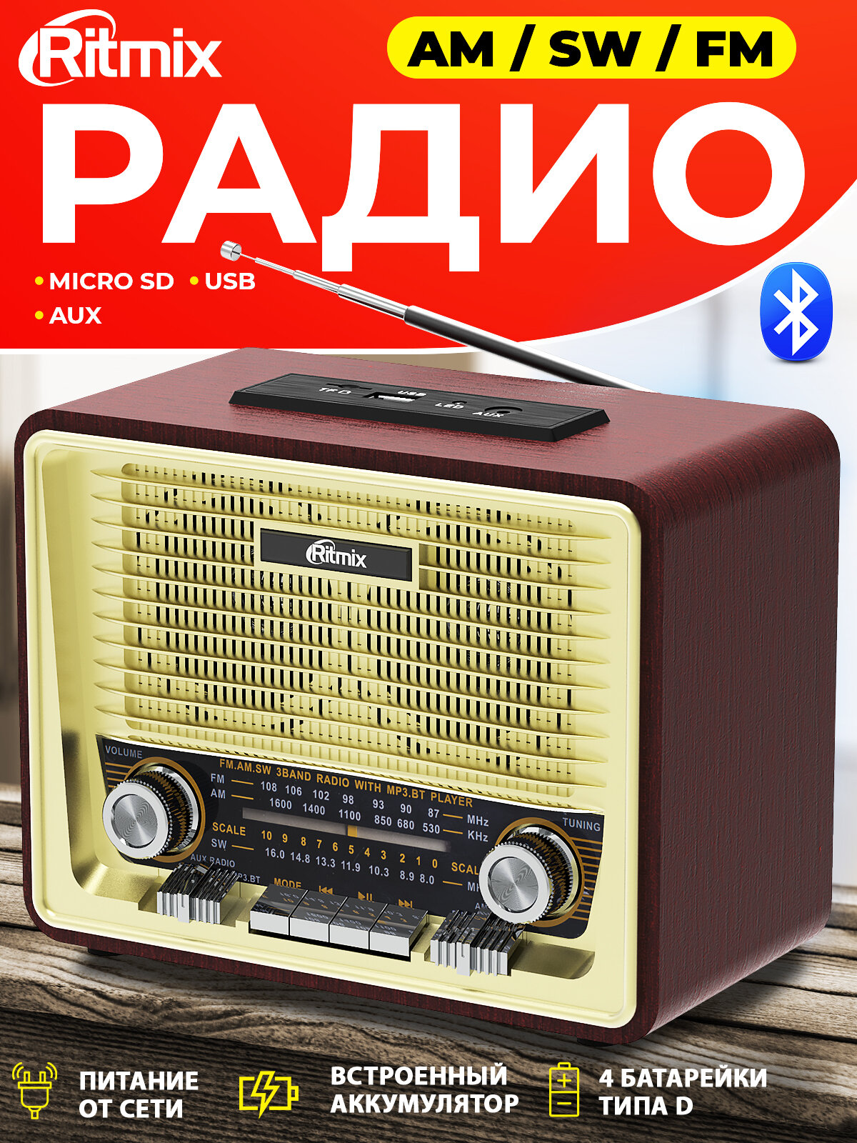 Радиоприёмник RITMIX RPR-088, черный, Режимы работы MicroSD / USB / AUX / Bluetooth, Воспроизводимые форматы аудио MP3, Диапазон радиочастот FM / КВ / СВ, Антенна телескопическая 360°, Динамики 2, Питание встроенный аккумулятор батарейки 4 x UM-1 сеть 220