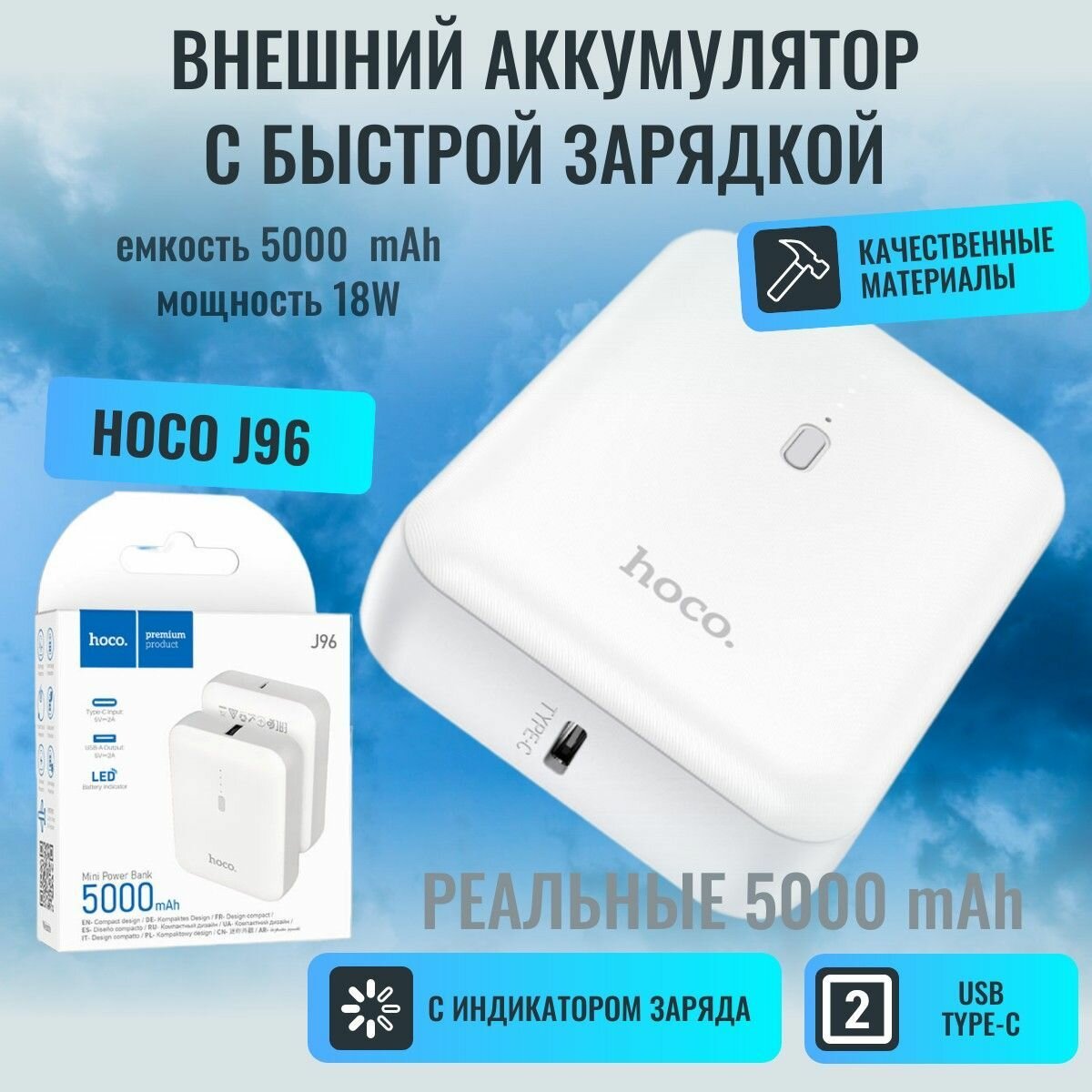 Компактный повербанк Hoco J96 5000 mAh с LED-индикатором USB-A/USB-C