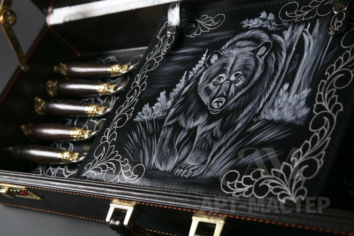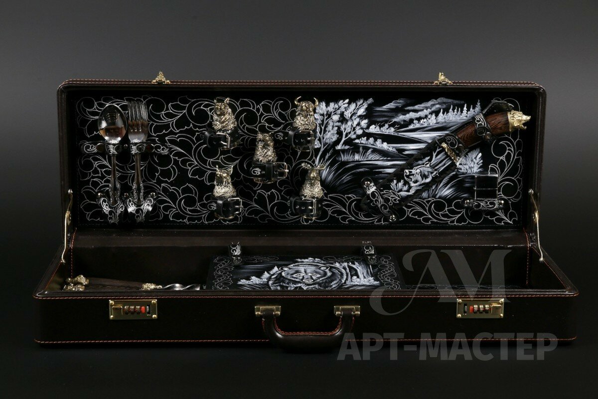 | Комплектация | Футляр из искусственной кожи Шампуры «Звери каменные» угол, рукоять Венге - 5шт. Вилки -5 шт Ложки -5 шт Нож туристический с художественным литьём -1 шт Тарелка - 5шт Стопки - 5 шт Бензиновая зажигалка - 1 шт |