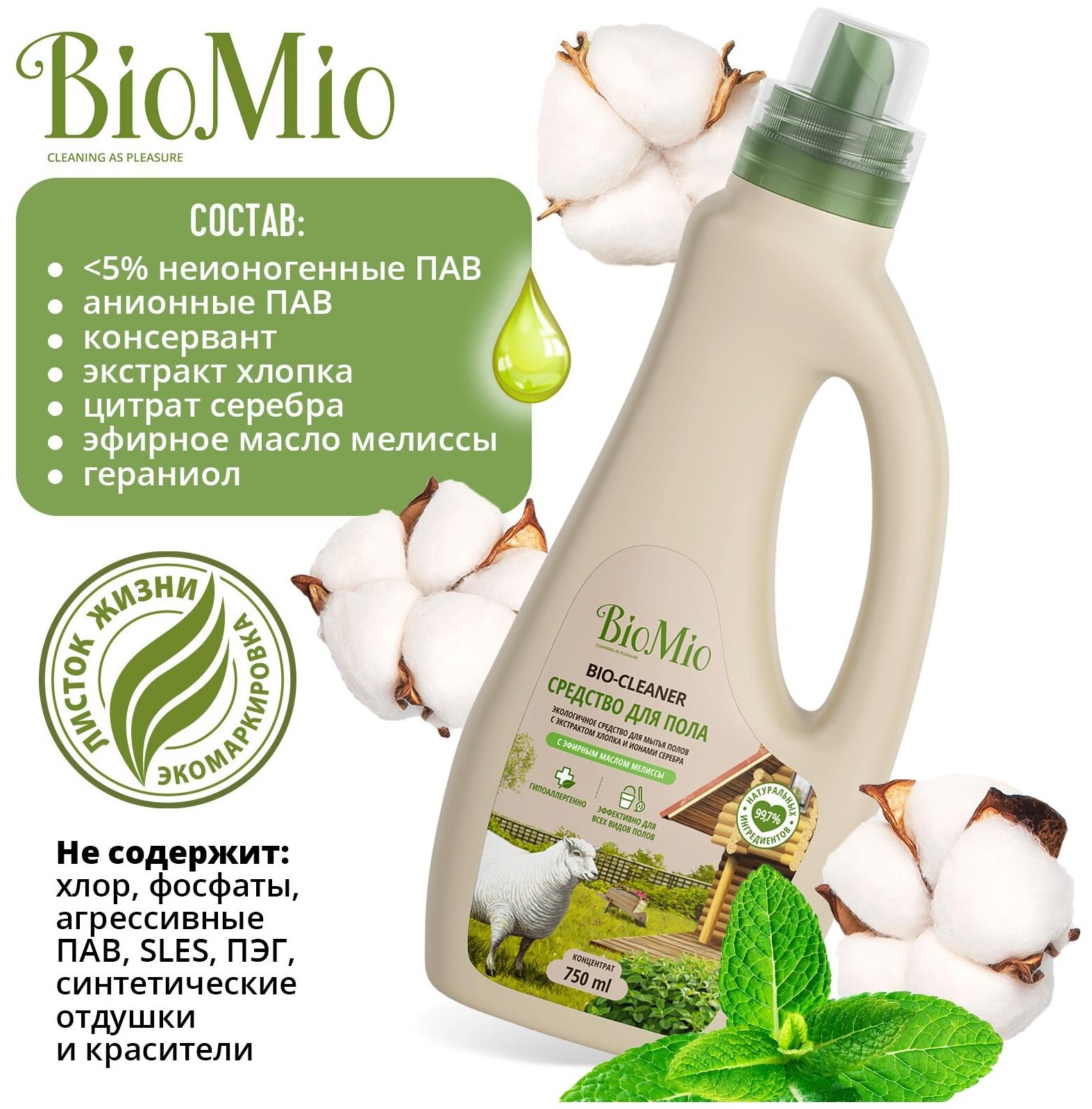 Средство для пола BioMio Bio-Floor Cleaner, гипоаллергенное, экологичное, с эфирным маслом мелиссы, 750 мл