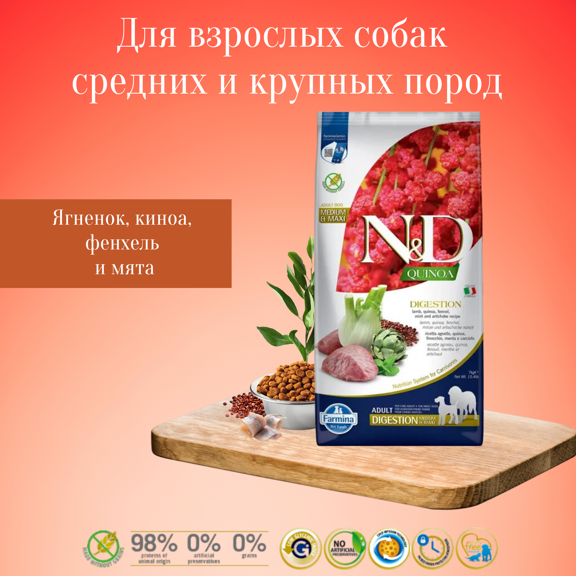 Сухой корм Farmina N&D Quinoa Digestion Lamb Adult Medium&Maxi, для взрослых собак средних и крупных пород, беззерновой, поддержка пищеварения, ягненок, киноа, фенхель, мята и артишок, 7 кг