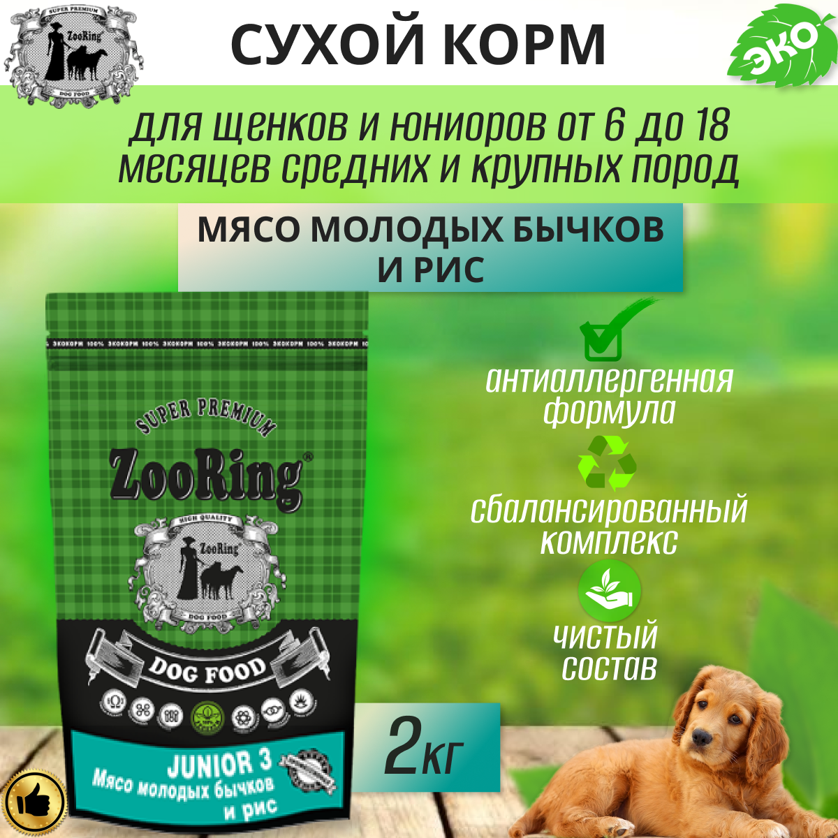 Сухой корм для щенков ZooRing мясо молодого бычка, с рисом 2 кг (для средних и крупных пород)