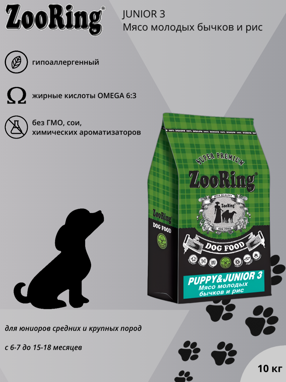ZooRing Puppy&Junior 3 Сухой корм для щенков, Мясо молодых бычков / Рис 10кг