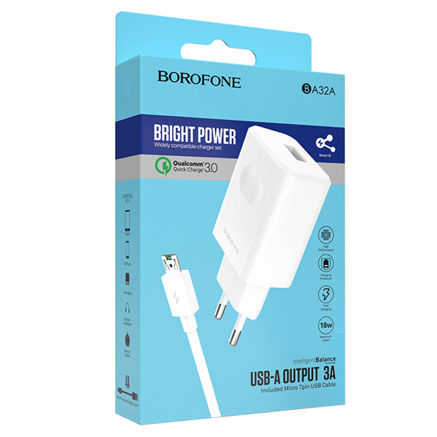 Сетевое зарядное устройство Borofone BA32A Bright Power 1xUSB QC3.0, 18W, 3А + кабель MicroUSB, 1м, белый
