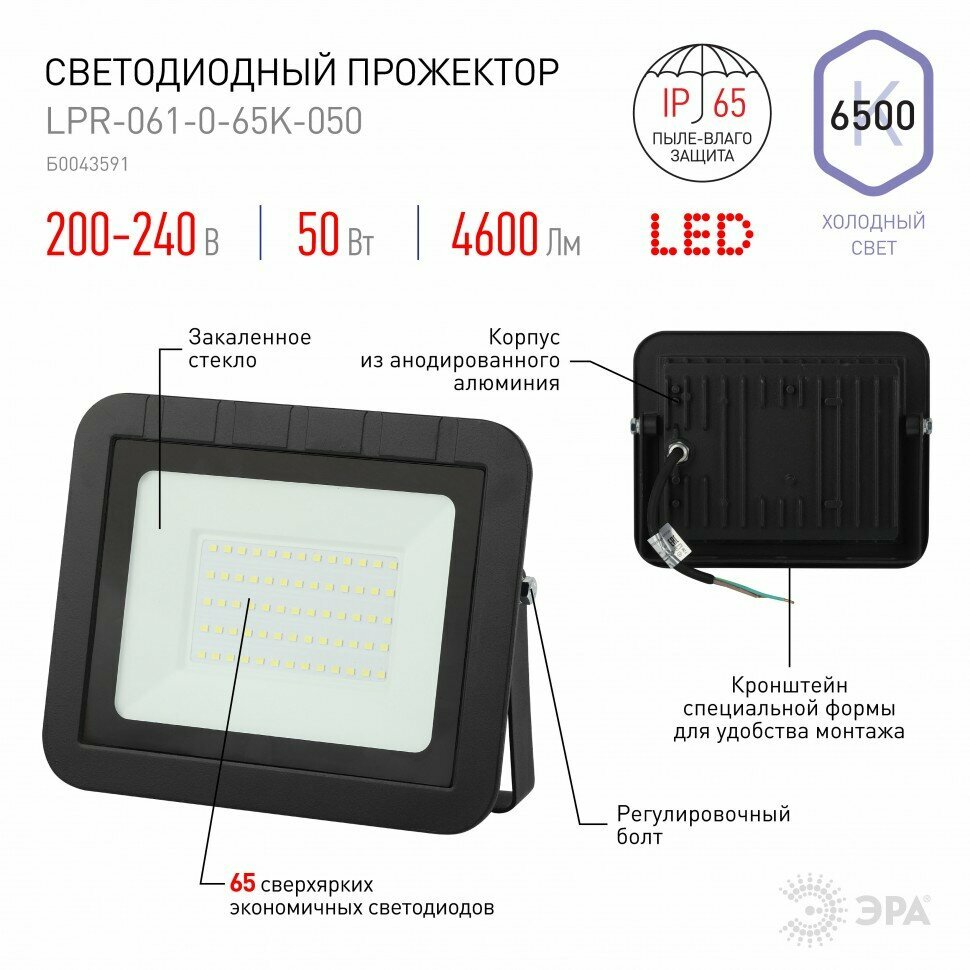 Прожектор светодиодный ЭРА LPR-061-0-65K-050 Б0043591 50Вт 4600Лм 6500К 205x165x33 Б0043591 .