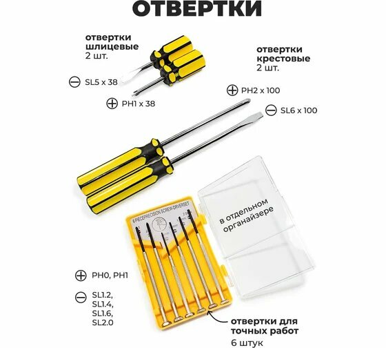 | Головки торцевые подробно | 1/4" 25 мм: 4, 4.5, 5, 5.5, 6, 7, 8, 9, 10, 11, 12, 13, 14 мм; 1/4" со вставками: PZ1, PZ2, PZ3, РН1, РН2, РН3, SL4, SL5.5, SL7, T10, T15, T20, T25, T30, Т40, H3, H4, H5, H6, H7, H8; удлинители 50, 100 мм; рукоятка 150 мм; вороток 115 мм; гибкий удлинитель 145 мм; адаптер-переходник 1/4(F)"-1/4"(F) 30 мм |
