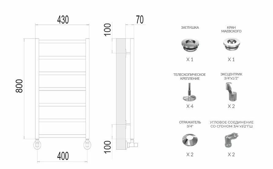 Полотенцесушитель TERMINUS Контур П7 (ШВ:400х800) водяной, нержавеющая сталь