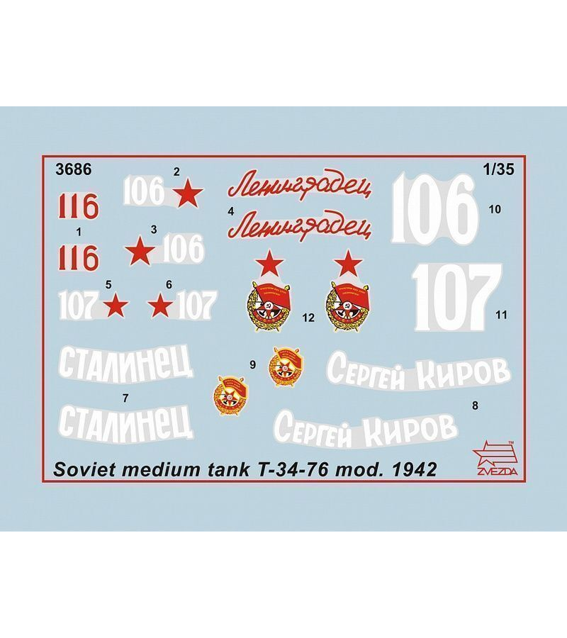 | Дополнительная информация | люки выполнены отдельными деталями; нейлоновая сетка для вентиляционных решёток, нить для имитации буксировочного троса; декаль для 3 вариантов: Т-34 №107 «Сергей Киров» из состава 1-й Ленинградской Краснознаменной танковой бригады, Ленинградский фронт январь-февраль 1943 г., Т-34 №106 «Сталинец» из состава 1-й Ленинградской Краснознаменной танковой бригады, Ленинградский фронт весна 1943 г., Т-34 № 116 «Ленинградец» из состава 1-й Ленинградской Краснознаменной танковой бригады, Красное село, январь 1944 г. |