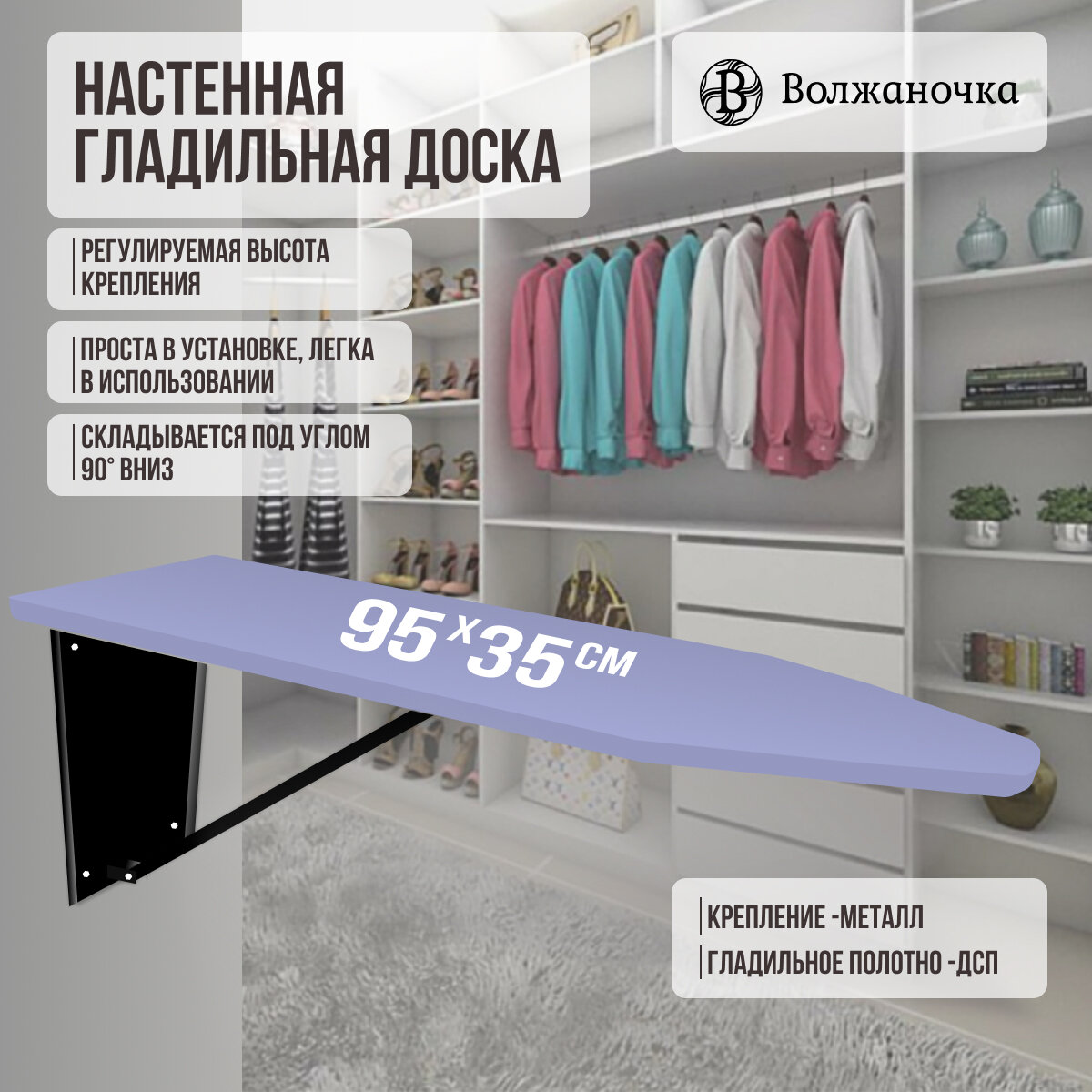 Волжаночка Гладильная доска настенная, размер столешницы 95х35см., цвет светло-фиолетовый