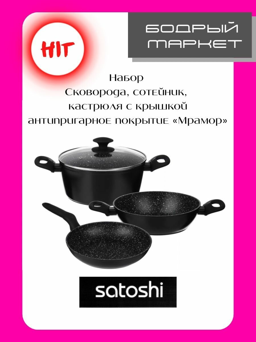 Набор посуды SATOSHI Стоун для приготовления: сковорода, сотейник, кастрюля, крышка, антипригарное покрытие мрамор