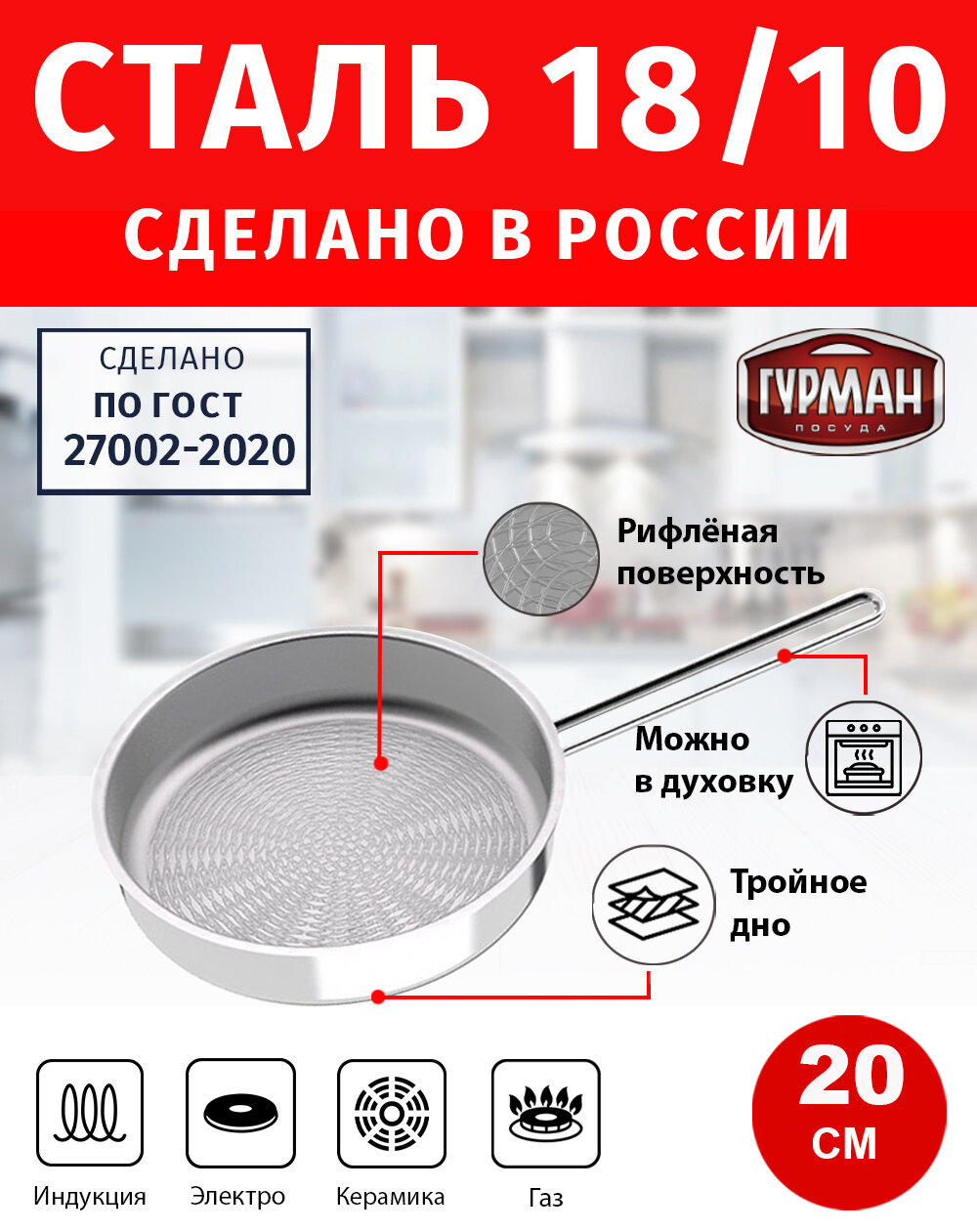 СохранитьСковорода гриль 20см гурман Классик нержавеющая сталь 18/10 AISI 304 ВСМПО салда индукция интересное:
