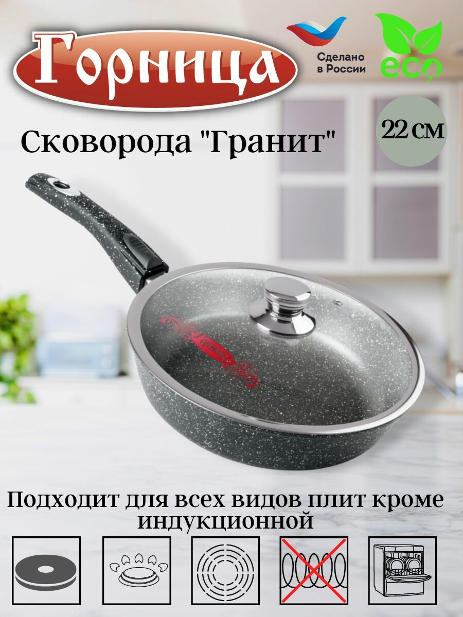 Сковорода 220/55мм со съемной ручкой с крышкой с2254аг горница