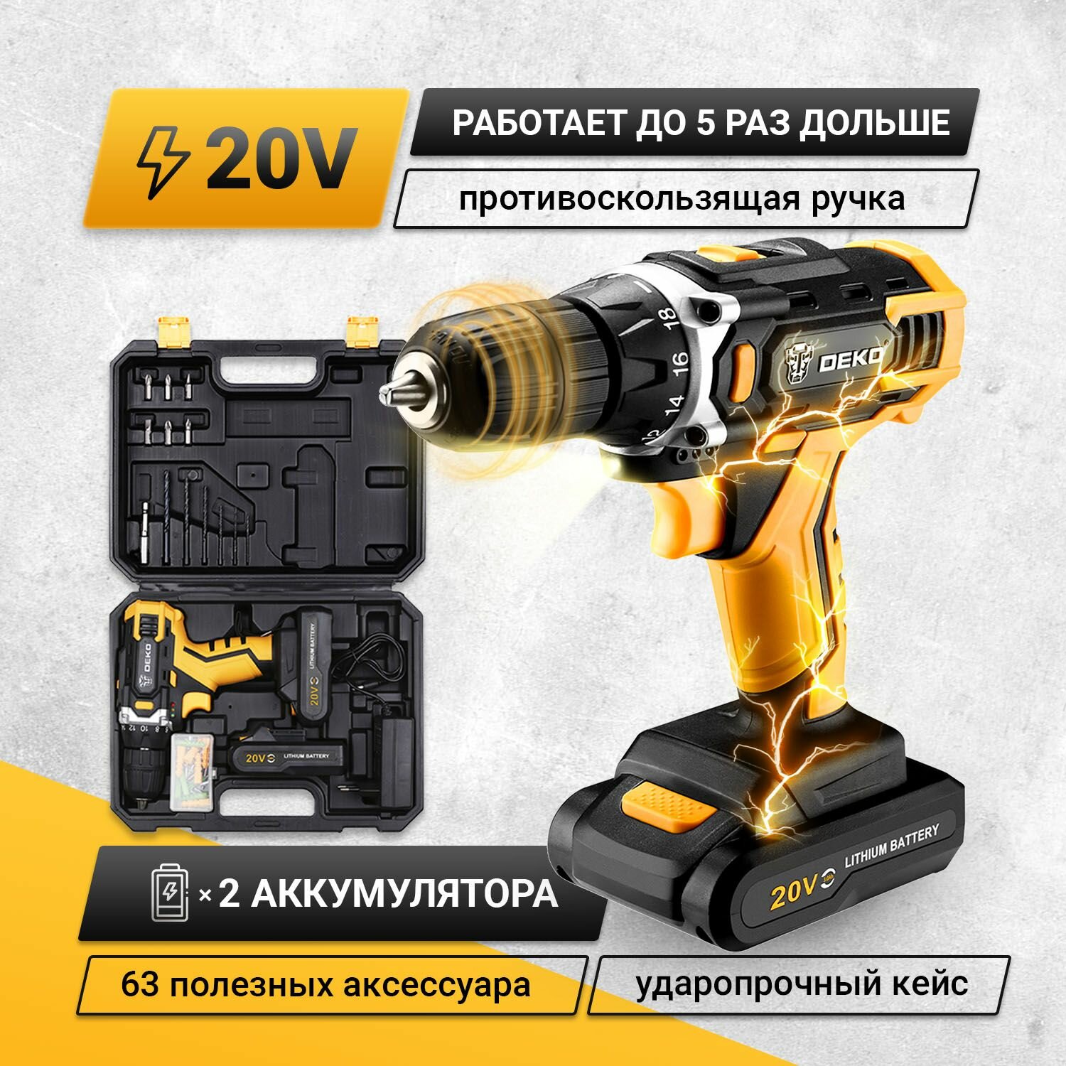 Аккумуляторная дрель-шуруповерт 20В DEKO DKCD20FU-Li + набор 63 инструмента в кейсе, 2x3.0Ач, з/у 063-4175