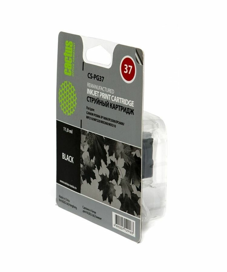 Картридж струйный Cactus CS-PG37 черный (9мл) для Canon Pixma iP1800/iP1900/iP2500/iP2600/MP140/MP190/MP210/MP220/MP470/MX300/MX310