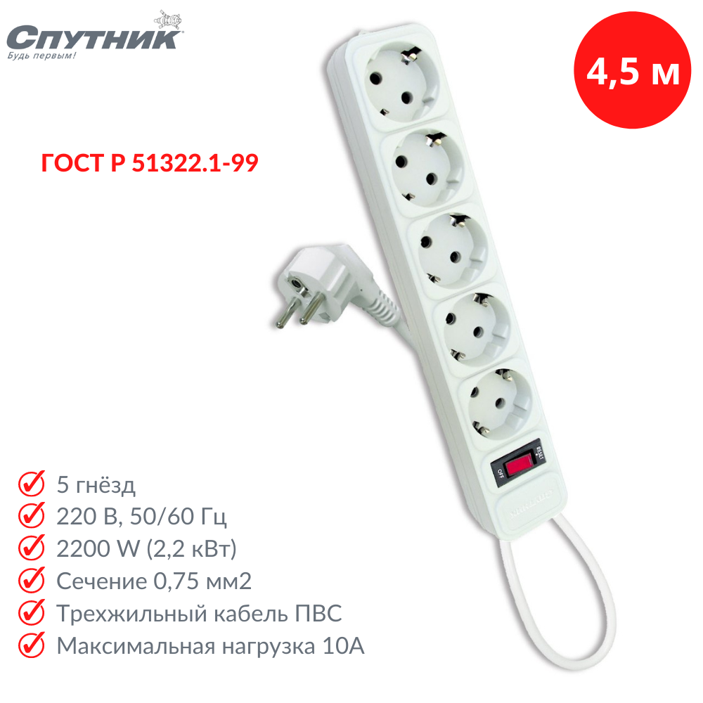 Сетевой фильтр 5 розеток 4,5м Спутник, белый