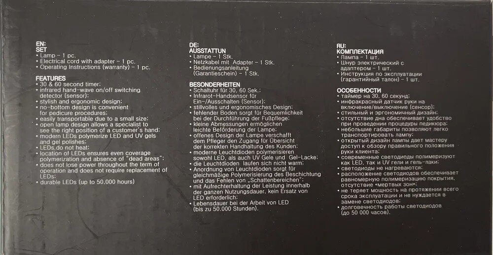 | Комплектация | лампа, шнур электрический с адаптером, инструкция по эксплуатации (гарантийный талон) |