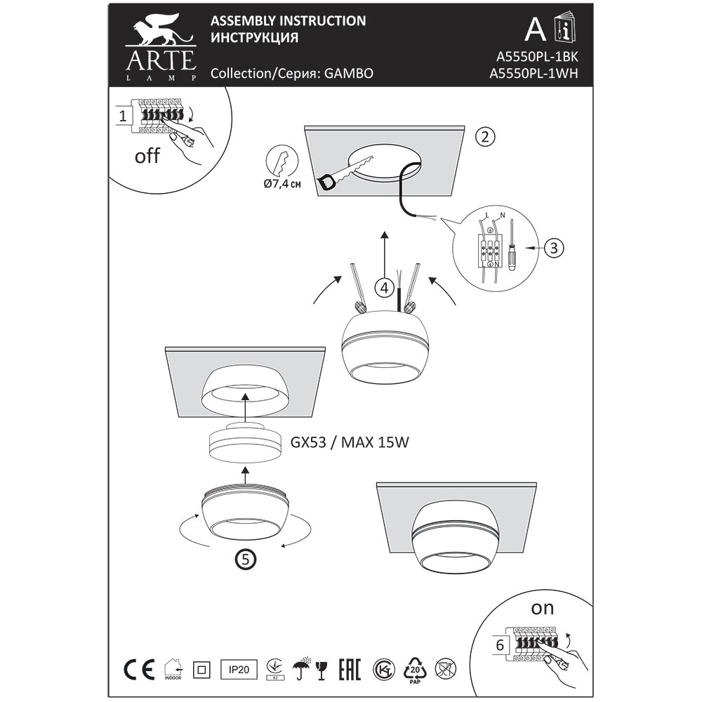 Светильник встраиваемый Arte Lamp GAMBO, A5550PL-1BK, 15W, GX53, Стиль Современный