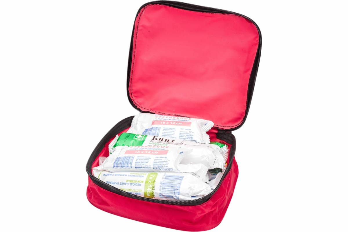 | Состав | жгут кровоостанавливающий 1 шт., бинт марлевый медицинский нестерильный 5 м × 5 см 2 шт., бинт марлевый медицинский нестерильный 5 м × 10 см 2 шт., бинт марлевый медицинский нестерильный 7 м × 14 см 1 шт., бинт марлевый медицинский стерильный 5 м × 7 см 2 шт., бинт марлевый медицинский стерильный 5 м × 10 см 2 шт., бинт марлевый медицинский стерильный 7 м × 14 см 1 шт., пакет перевязочный стерильный 1 шт., салфетки марлевые медицинские стерильные, не менее 16 см × 14 см №10 1 уп., лейкопластырь бактерицидный, не менее 4 см × 10 см 2 шт., лейкопластырь бактерицидный, не менее 1.9 см × 7.2 см 10 шт., лейкопластырь рулонный, не менее 1 см × 250 см 1 шт., устройство для проведения искусственного дыхания "Рот-Устройство-Рот" 1 шт., ножницы 1 шт., перчатки медицинские нестерильные 1 пара, футляр для аптечки 1 шт. |