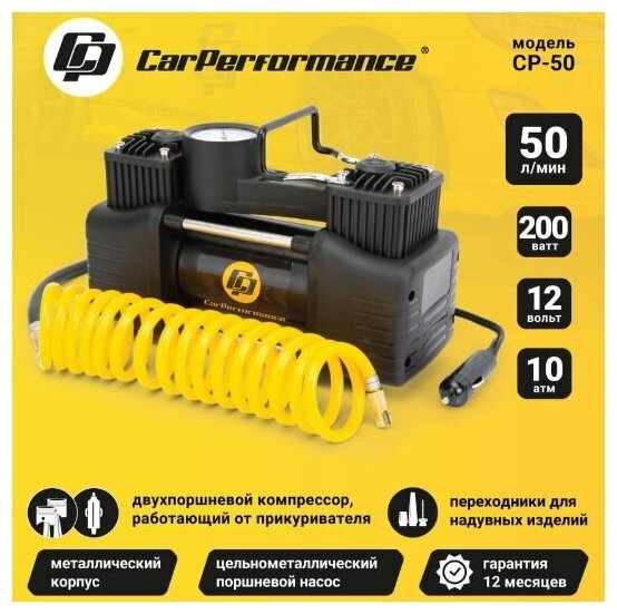 Компрессор воздушный CAR PERFORMANCE CP-50, 50 л./мин., 12V/16А, 200W, 10 Атм., двухпоршн., шланг 0,6 м. + доп. шланг из PU 2,5 м., КП 2,8 м., питание от прикуривателя