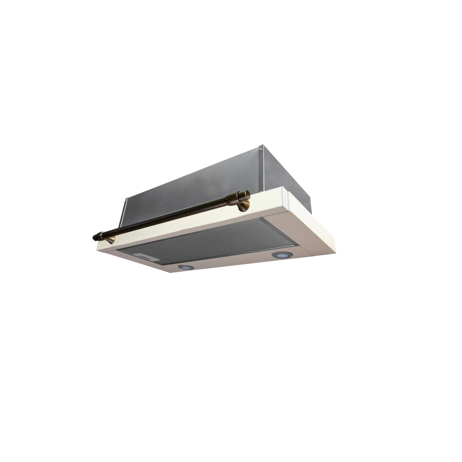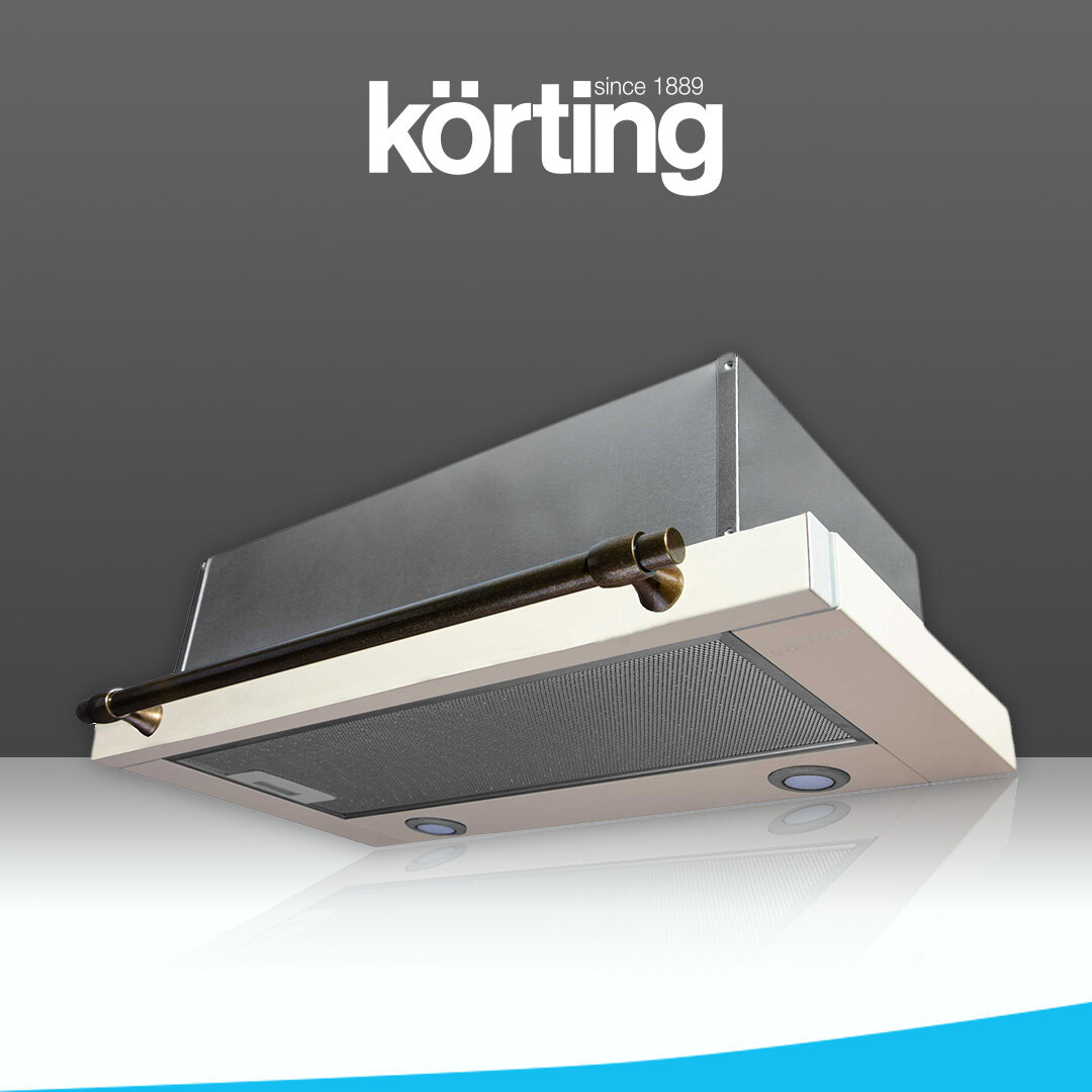 Вытяжки Korting/ "Встраиваемая вытяжка с выдвижным экраном в ретро дизайне,ширина 60 см, 3 режима, механическое управление, 650 м3/ч., алюминиевые жировые фильтры, LED освещениe - 2 лампы, ур.шума 57дб, рейлинг в цвете бронза, цвет - слоновая кость